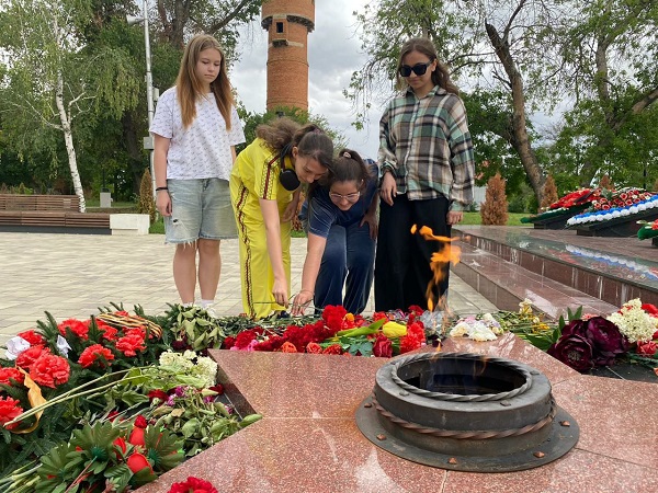В понедельник ребята приняли участие в линейке, посвящённой Дню памяти и скорби. 22 июня 1941 года началась Великая Отечественная война, унёсшая около 27 миллионов жизней граждан Советского Союза. Ребята почтили минутой молчания память всех павших, активисты лагеря возложили цветы у мемориала Скорбящая мать.